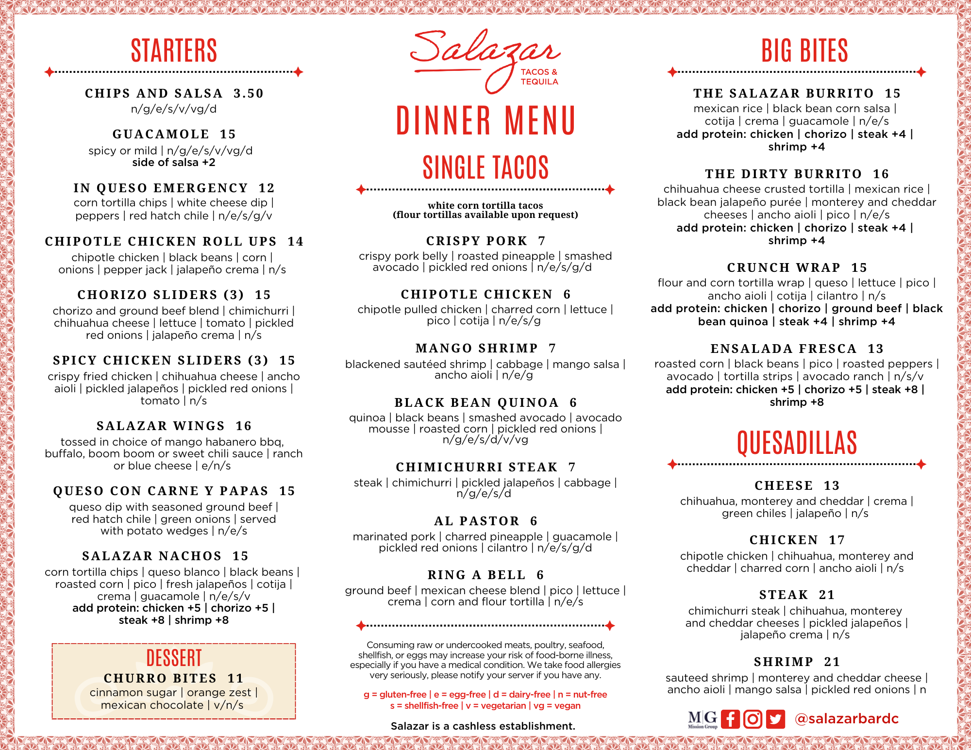 corn tortillas | queso blanco | black beans | roasted corn | pico | fresh jalapeños | cotija | crema | guacamole |